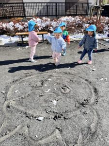 地面に鬼の絵を描いて、みんなで雪玉を投げて鬼退治!👹